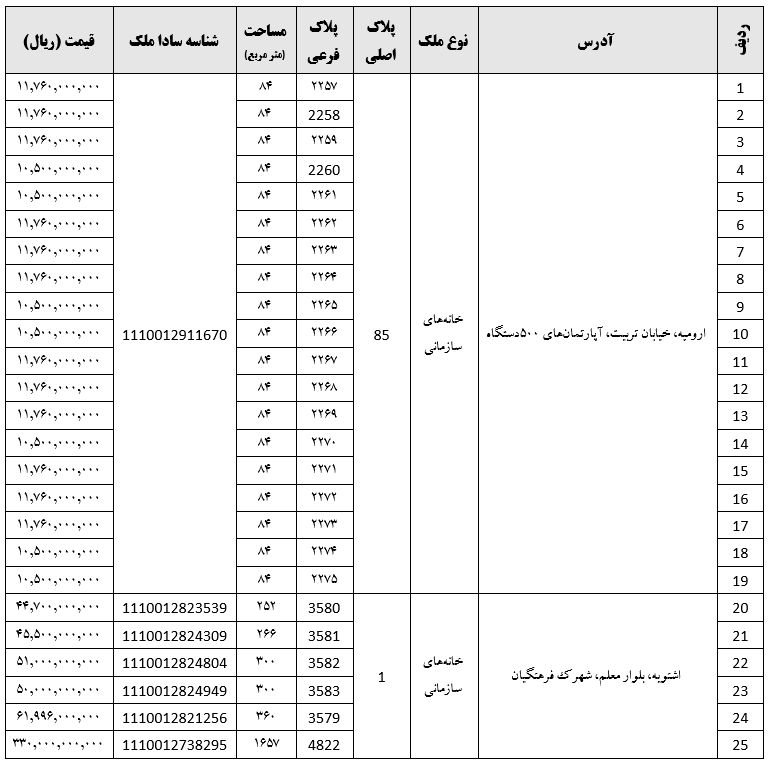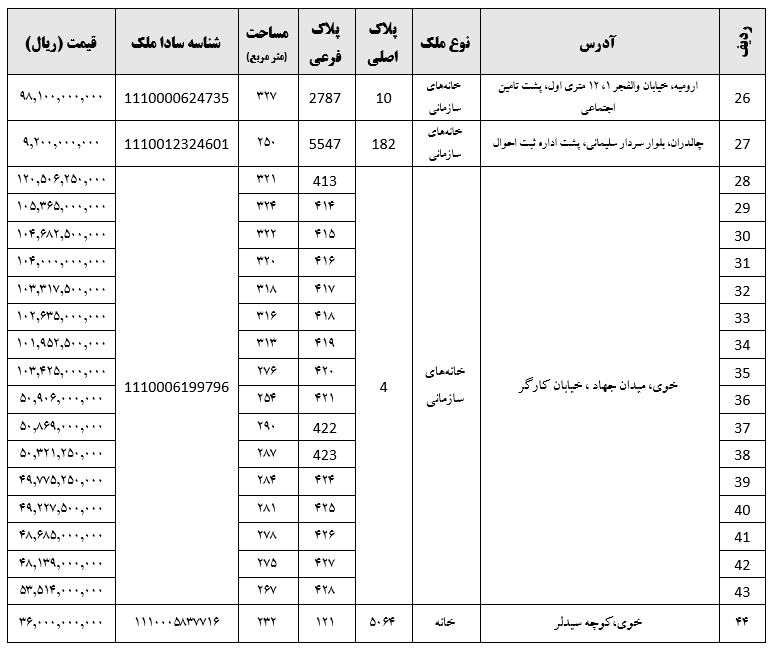 - قیمت پایه و روش مولدسازی «تعداد (44) فقره ملک» واقع در استان آذربایجان غربی مطرح و واگذاری املاک مذکور از طریق روشهای مندرج در ماده (12) آییننامه اجرایی مولدسازی داراییهای دولت به شرح زیر مصوب گردید: